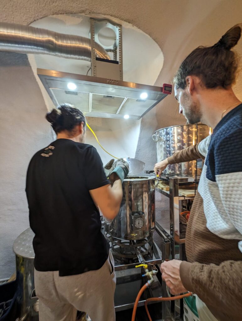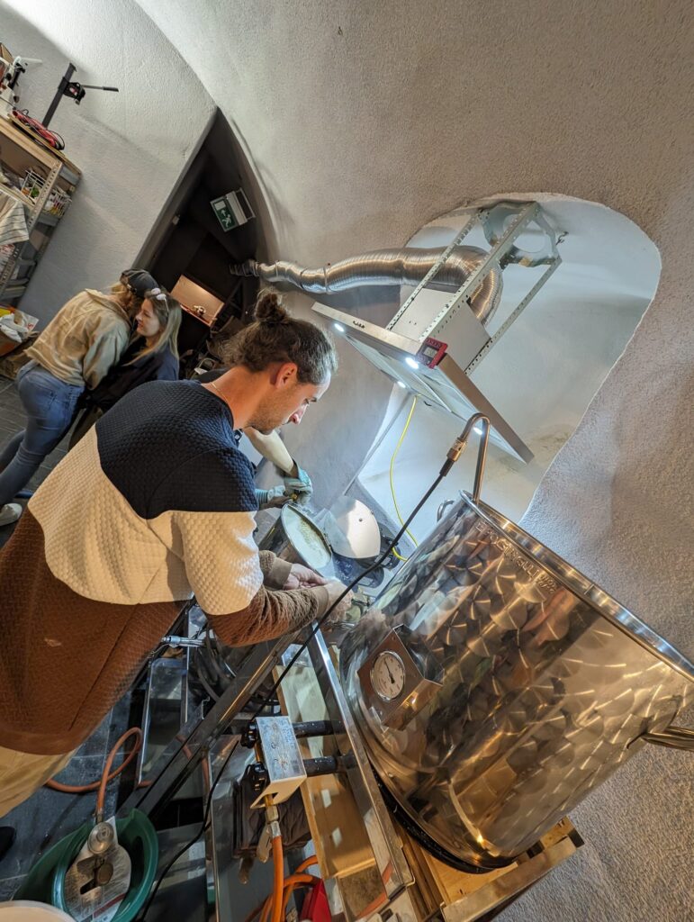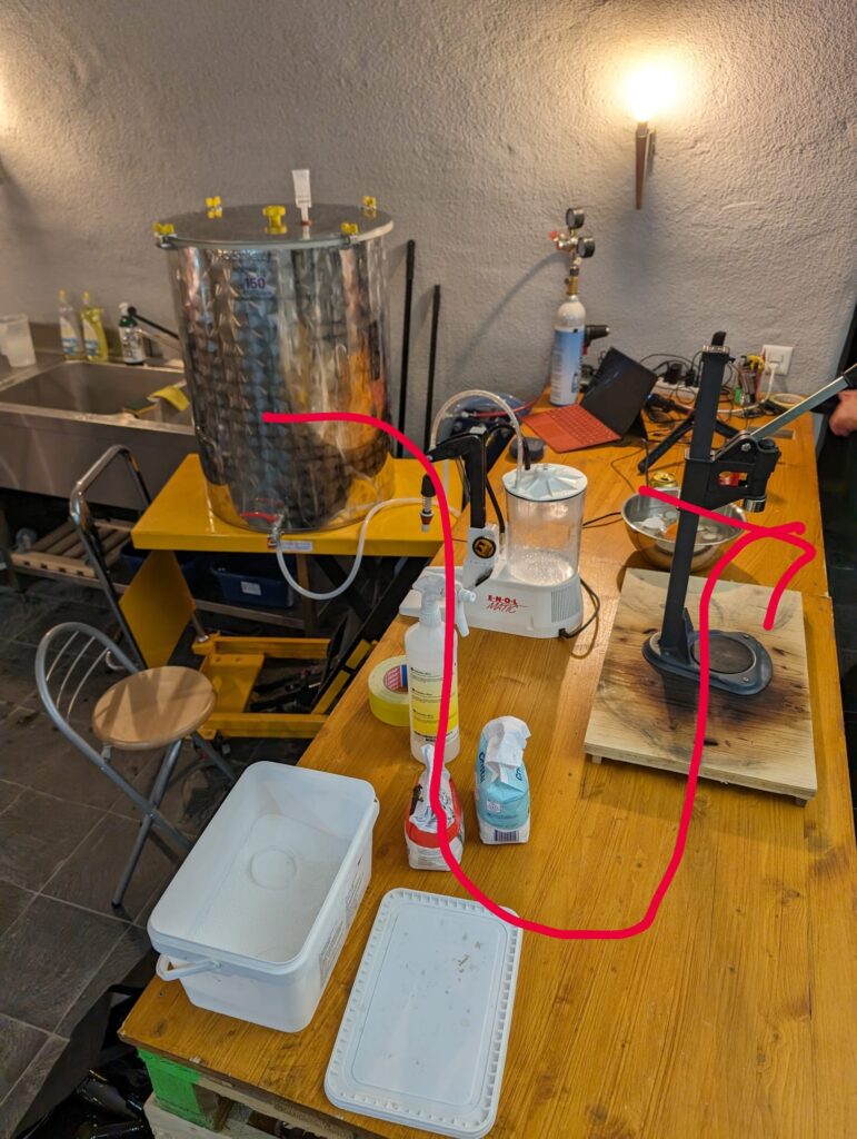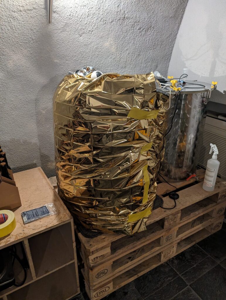 Première bière de G&M fermentée avec la levure Voss Kveik, après 48h plus d’activité dans le barbotteur… (Panique !) Intervention d’urgence pour tenter de réchauffer le moult (à base de couverture chauffante et de couverture de survie) pour faire repartir la fermentation. Après beaucoup d’angoisse et quelques recherches sur Google je me suis aperçu que ce type de levure pouvait tout à fait finir le job en 48h et que l’arrêt de l’activité visible était normal.
