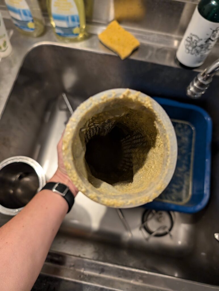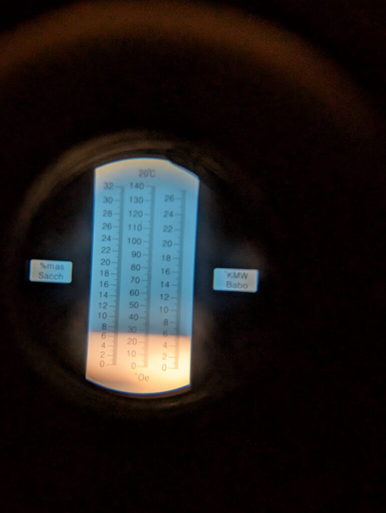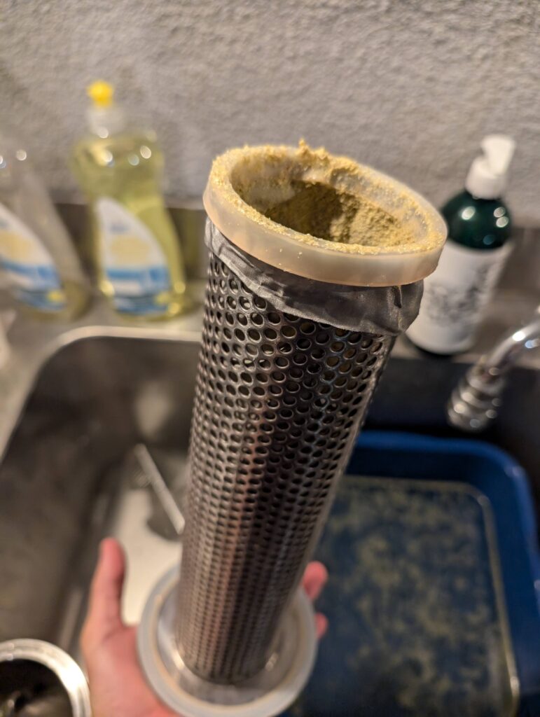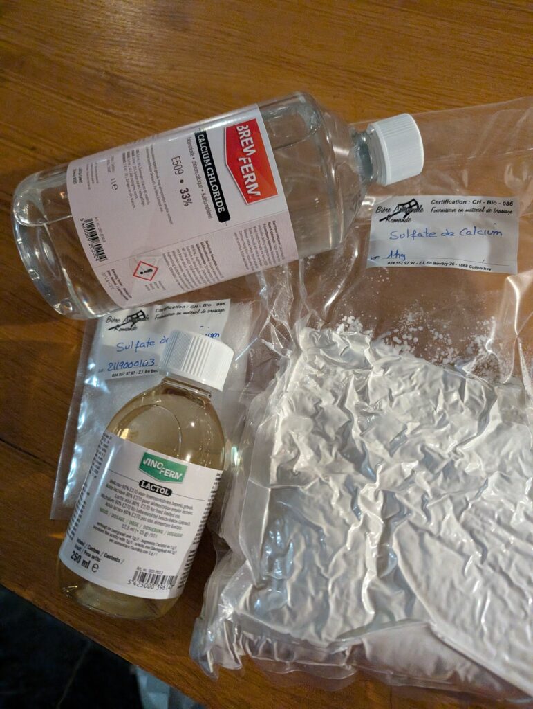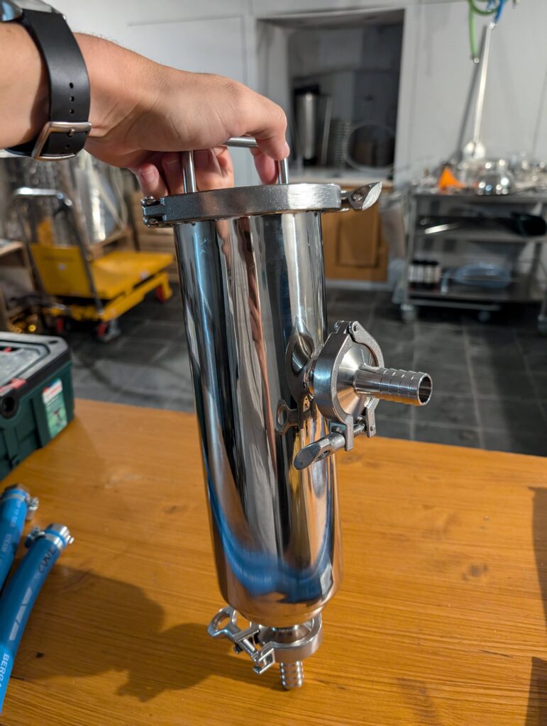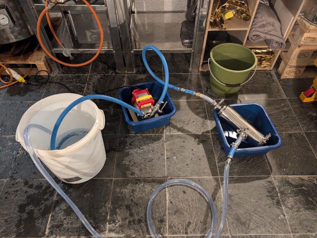 Première fois également que nous « corrigeons » l’eau (empatage et rinçage) pour coller au profil souhaité de la bière (Pale Ale). Première fois aussi que nous tentons d’utiliser notre filtre à houblon flambant neuf (échec total, mesh trop fin, tout est passé a côté… il va falloir re-nettoyer l’échangeur à plaques… arf.).